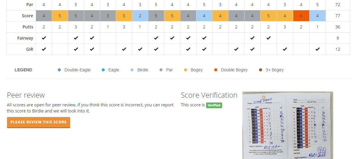 For a handicap to be trusted all scores should be open for peer review. With this is mind, anyone in Birdie can view any other players scores and see how the score was added to the system.